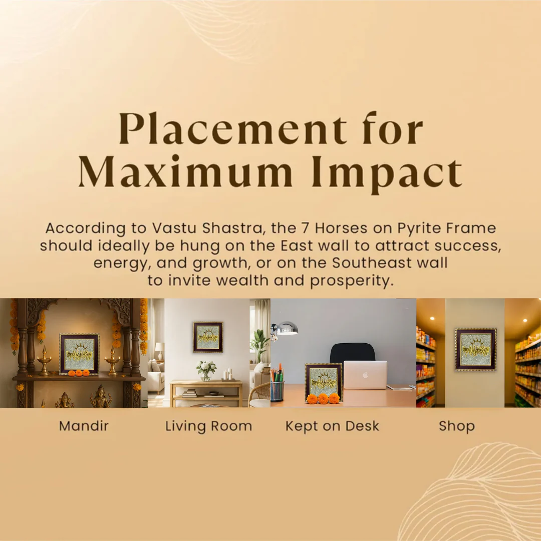 In Vastu Shastra, Seven Running Horses represent speed, growth, stability, leadership, and success. When combined with Raw Pyrite, a natural abundance crystal believed to attract money, luck, confidence, and business expansion, the energy becomes even more powerful. This frame is ideal for entrepreneurs, business owners, working professionals, and students who aspire to achieve remarkable success in life.
